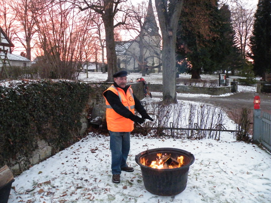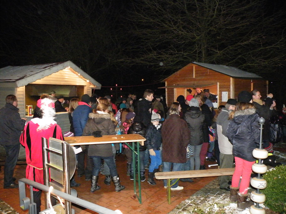 Auf dem Hof des Gemeindehauses kam, begleitet durch weihnachtliche Musik, eine schöne Stimmung auf. Mit Glühwein, Punsch und Bratwurst waren auch die kalten Temperaturen dieses Dezembertages erträglich. Immer wieder wurde die hell angestrahlte Kiche bewundert.