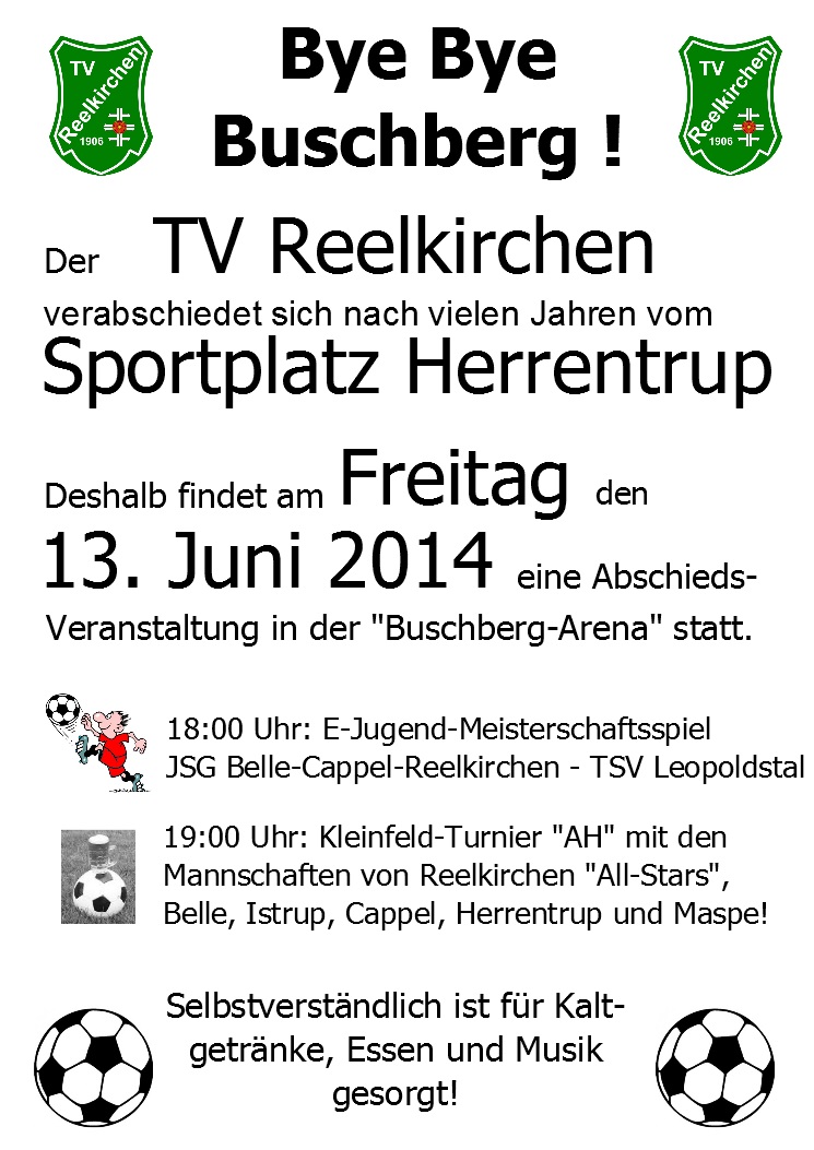 Nach jahrelanger Nutzung und Betreuung übergeben wir zum 01.07.2014 die Verwaltung des Sportplatz Herrentrup inkl. des Sporthauses zurück an die Stadt Blomberg. Aus diesem Grund wollen wir uns von der „Buschberg-Arena“ gebührend verabschieden.