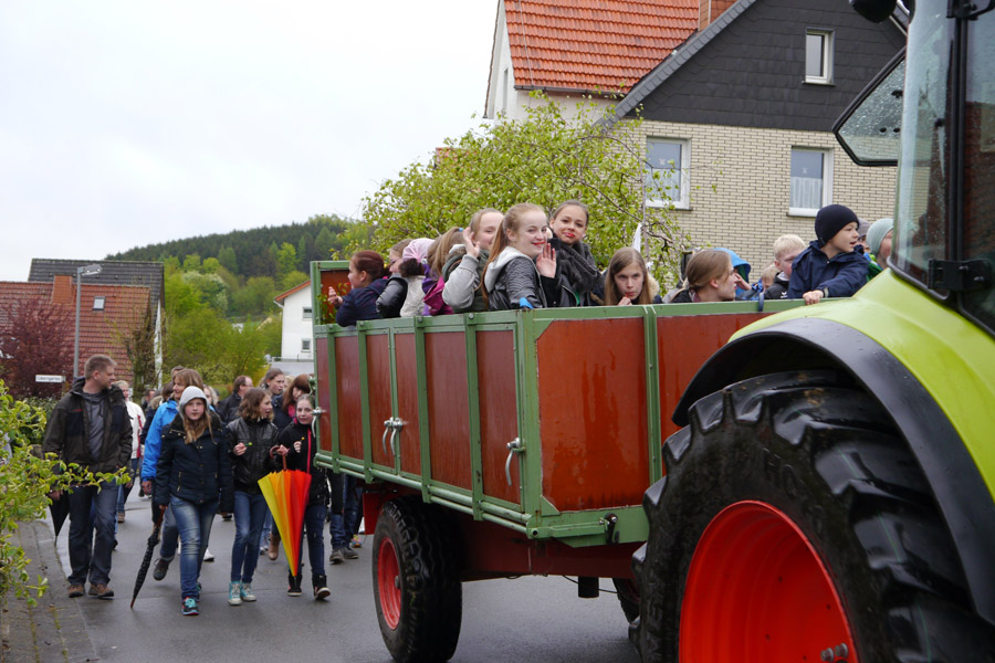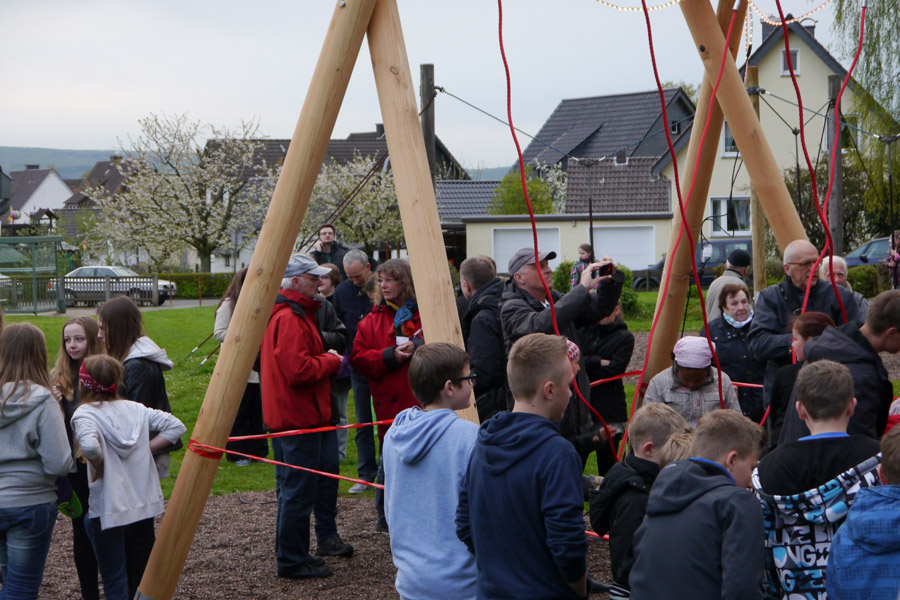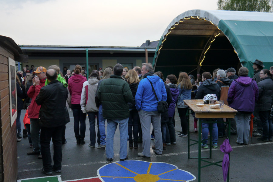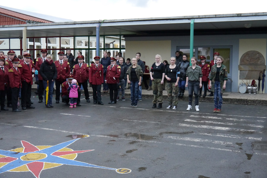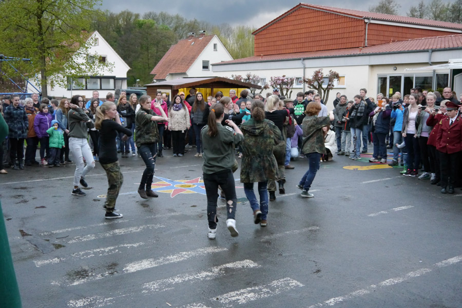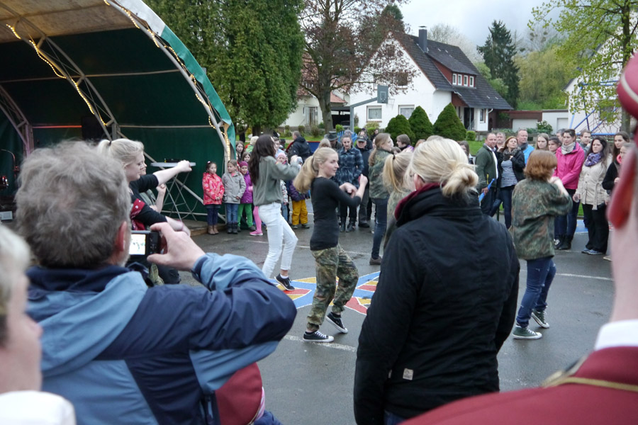 „Das Wetter war schon einmal besser am 30.04.“, hörten wir oft an diesem Abend. Leider – oder besser „Gott sei Dank“ – haben wir darauf keinen Einfluss. Mit kurzer Verspätung begann unser Umzug auf dem Spielberg. Der Spielmannszug und viele Kinder trotzten dem nassen Wetter und so erreichten wir gegen 19:00 Uhr in einer großen Gruppe den Schulhof. Nachdem der Maibaum geschmückt und aufgestellt wurde, erfreuten uns die jungen Tänzerinnen der Videoclip-Dancing-Gruppen mit ihren neuesten Stücken.