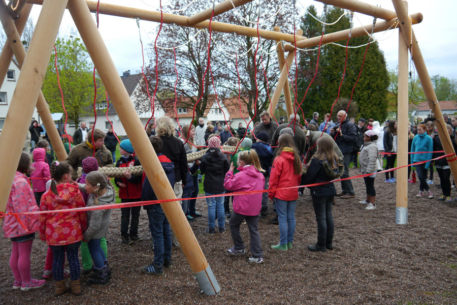 Dann klangen die Melodien des Spielmannzuges Belle erneut durch die Straßen. Sie führten einen weiteren kleinen Umzug an, der den Tampen für die neue Schaukel zum Schulhof transportierte. Diese neue „Tampenschaukel“ konnte dank der Erlöse des Patchwork-Events 2013 angeschafft werden. Und so war es an diesem Abend auch Treny Wildeboer, die diese einweihen und an die Ortsvorsteher übergeben konnte. Ortsvorsteher Jens Blanke bedankte sich bei Treny und die Kinder konnten die neue Schaukel endlich ausprobieren.