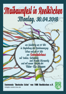 und den Baum aufrichten. Dort erwarten Euch, Eure Nachbarn und Freunde neben der schönen Tradition des Maibaumschmückens einige neue Highlights, wie ein beaufsichtigter Tobe- und Spielbereich, die vorbereiteten Tänze der Videoclip-Gruppen und eine Kinderdisco. Dafür dürfen sich die Kids ruhig auch nach dem Motto „Mama leiht mir ihren Lippenstift“ oder „Echte Kerle tragen Haargel“ zuhause einmal richtig aufbrezeln. Wir freuen uns, wenn Ihr bei einem Getränk entspannt den Abend mit uns genießt und die schönen alten Bräuche des Maifestes in unserem Dorf mit uns weiterführt.