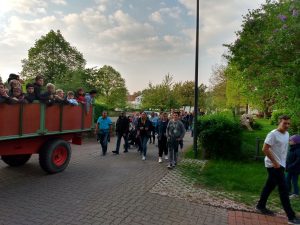 Es gab einen kleinen Umzug durch Reelkirchen unter Begleitung des Spielmannszugs Istrup, welcher vom Spielberg bis zum Gemeindehaus führte. Die Kinder fuhren im Anhänger des Treckers mit, in dem auch schon der Maibaum auf seinen Einsatz wartete. Am Gemeindehaus angekommen, wurde er feierlich aufgestellt und von den Kindern geschmückt.